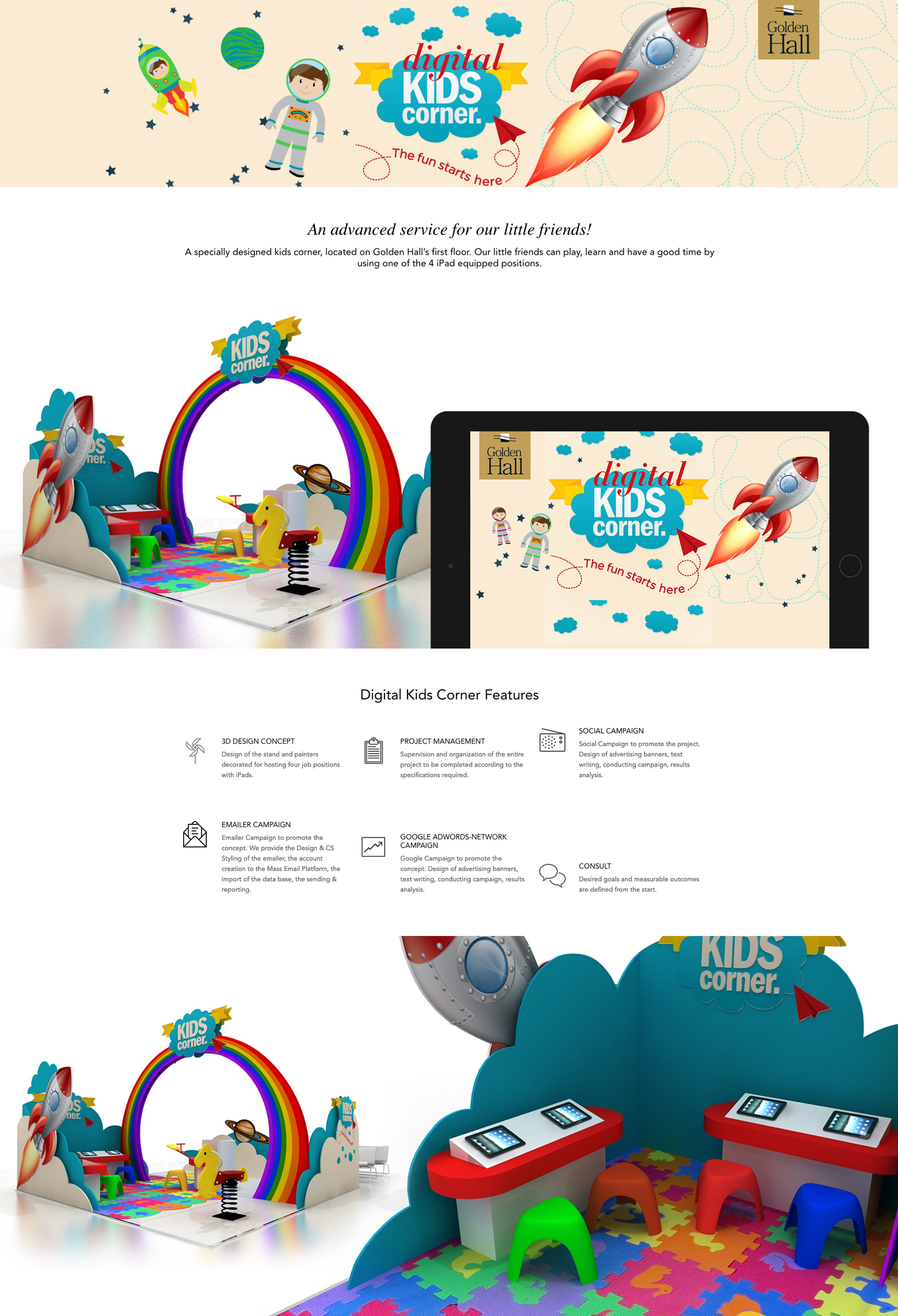 A specially designed kids corner, located on Golden Hall’s Shopping center. Our little friends can play, learn and have a good time by using one of the 4 iPad equipped with amazing 3d games and other digital services.